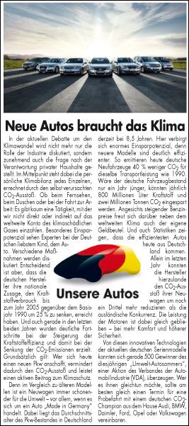 VDA Materndienst unterstützt die Klima-Kampagne Die Besonderheit bei diesem Auftrag lag darin, dass die Beiträge zu vorher festgelegten Terminen in Deutschlands größten Tageszeitungen erschienen sind. Der VDA unterstützte damit eine nur noch kurze Zeit laufende Kampagne für klimaschonende Fahrzeuge. |